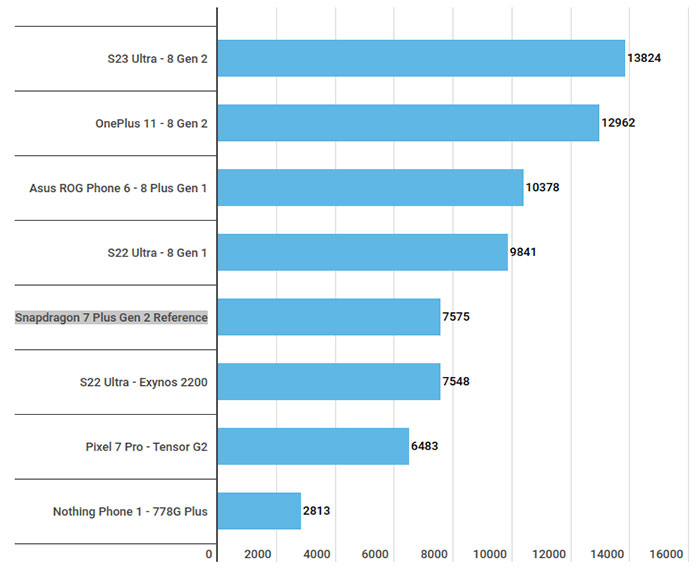 В AnTuTu чип Snapdragon 7+ Gen 2 набирает немногим более миллиона «попугаев», что примерно соответствует уровню MediaTek Dimensity 9000 и выше, чем показатели Dimensity 8200.