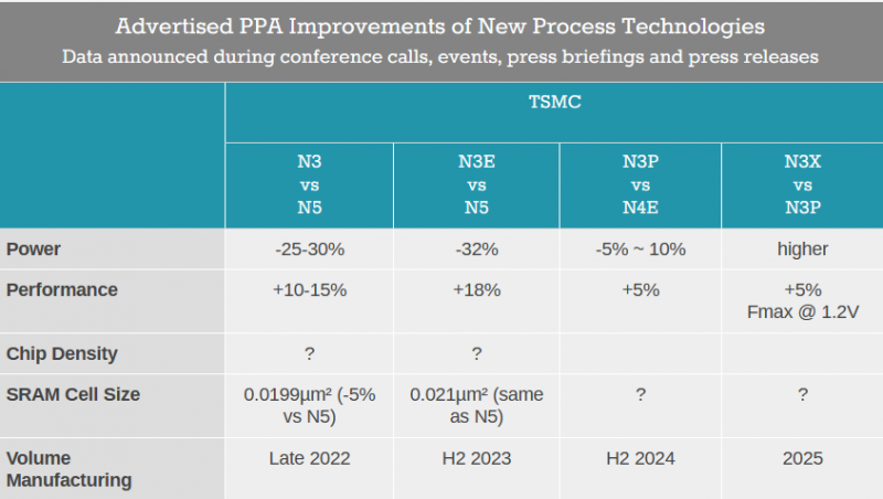 Также TSMC упомянула и самый интересный техпроцесс линейки N3 под названием N3X, который, в сравнении с N3P, предложит как минимум на 5% более высокие тактовые частоты, а также поддержку напряжения 1,2В, что является довольно экстремальным для техпроцесса 3-нанометрового класса.