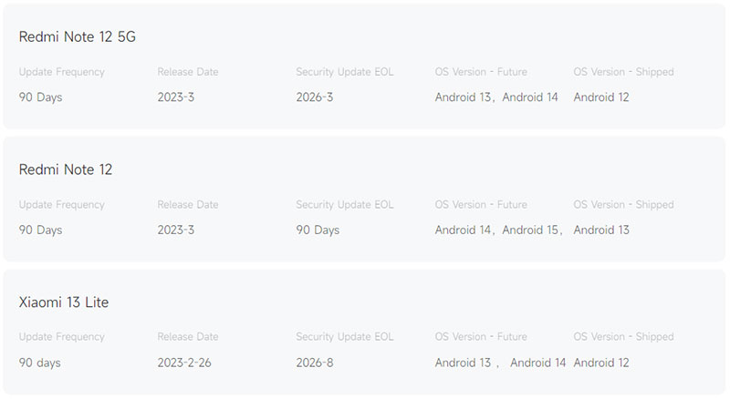 К примеру, показанный на скриншоте Xiaomi 13 Lite представлен в феврале 2023 года, патчи безопасности он будет получать до августа 2026 года, а в перспективе он точно получит крупные обновления на базе Android 13 и Android 14.